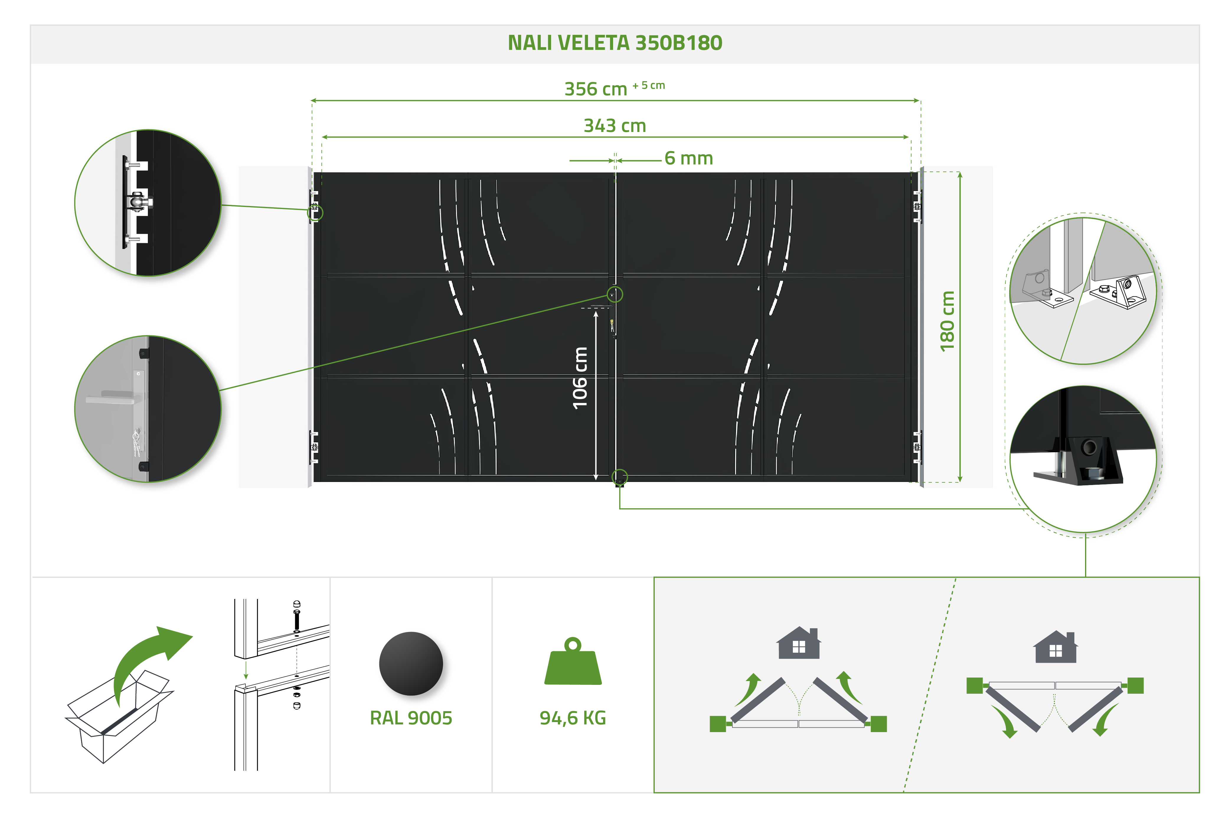 Matte black steel gate 3.5m NALI VELETA H.180cm