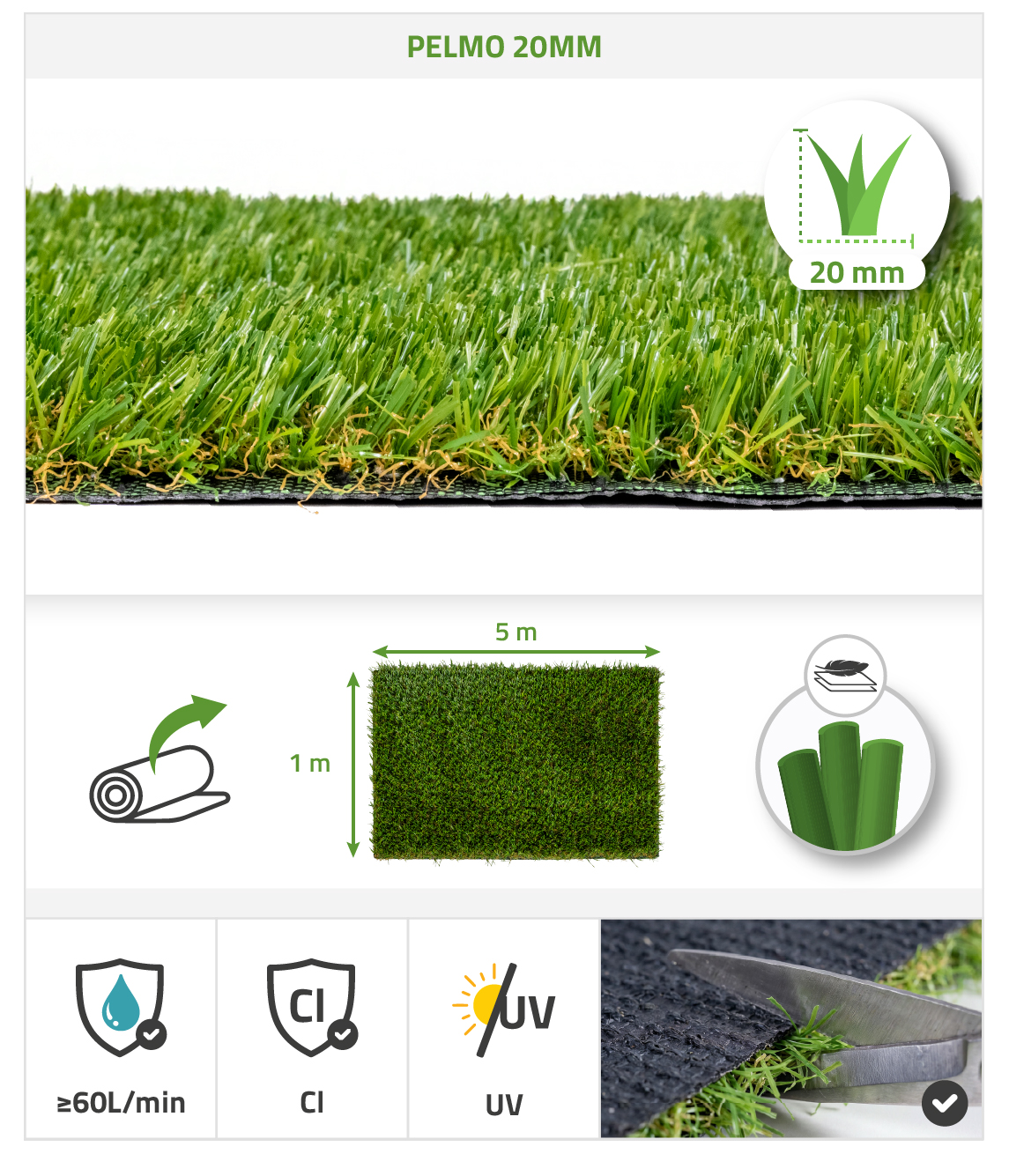 Med sine 20 mm fibre tilbyder POLMO kunstgræs et rent og afbalanceret udseende, perfekt til dem, der ønsker en naturlig effekt uden overdreven fylde. Ideel til terrasser, altaner eller små haver, kombinerer det holdbarhed, komfort og æstetik, samtidig med at det forbliver nemt at installere og vedligeholde. Et smart valg til et elegant og praktisk udendørsområde, hele året rundt.